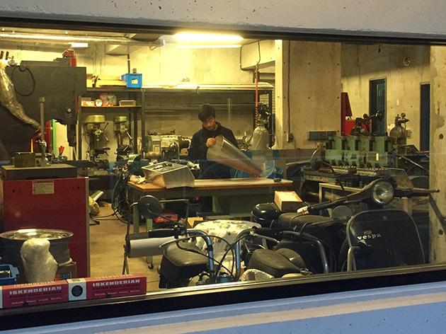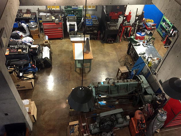 まるでバウハウスをほうふつとさせる1階のアトリエでは知る人ぞ知る金属加工のエキスパート「KMRD」が日夜作品を生み出している。